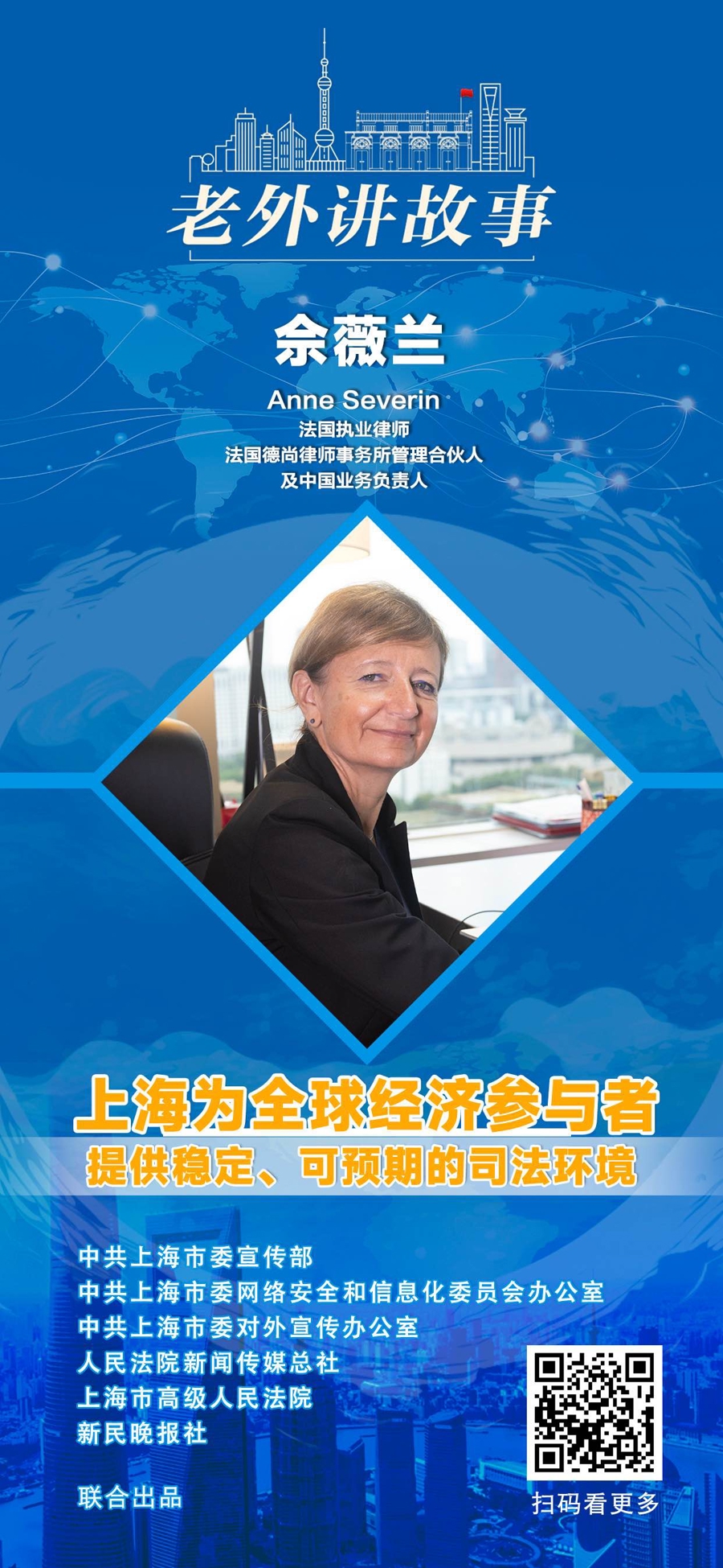 佘薇兰(Anne Severin)来自法国,是法国德尚律师事务所的执业律师,也是法国对外贸易顾问,“上海,有‘东方巴黎’之称,是我的第二故乡,也是我在中国从事执业法律服务生涯的起点”。