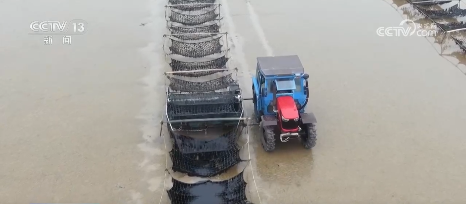 从空中俯瞰,在如东这片退潮后的滩涂上,一排排紫菜筏架,整齐有序。这几天天气晴好,工人们趁着退潮时机,抢收紫菜。