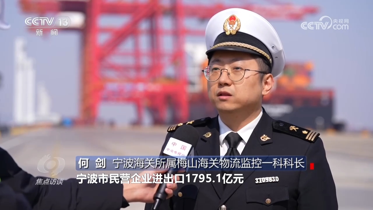 宁波海关所属梅山海关物流监控一科科长何剑:“1月到2月,宁波市民营企业进出口1795.1亿元,同比增长11.3%,占宁波市进出口总值的76.8%。”