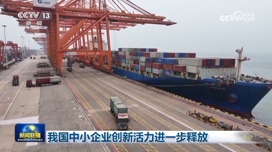 在广西钦州港码头,这里正在进行远洋货轮的装船作业。工作人员告诉记者,集装箱里一半货物都是高新技术产品,而这些大部分来自中小企业。