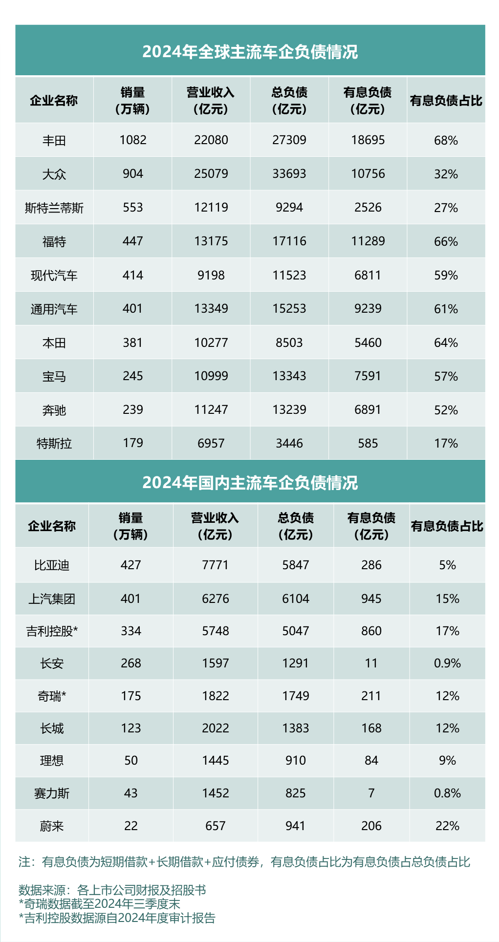 尽管高负债是车企共性,但如果逐一拆解负债结构,不难发现其实每家车企的债务情况各不相同。结合规模来看,可以看出销量越大、营收越高,需要的原材料等采购成本也就越大,总负债就越高。在全球巨头中,2024年丰田和大众的总负债均超万亿元,并且都超过了同期营收。
