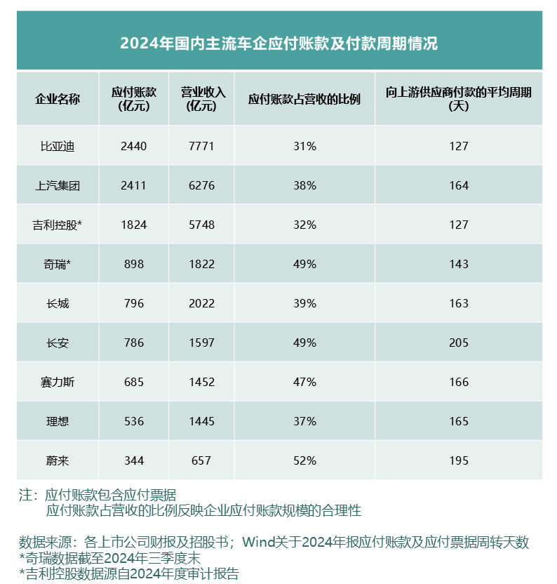 在国内主流车企中,蔚来应付账款占营业收入的比例为52%,长安为49%,长城汽车为39%,上汽集团为38%,比亚迪为31%。在付款周期方面,据Wind数据,截至2024年末,比亚迪与向上游供应商付款的平均周期是127天,为业内最短之一,体现出强大的供应链管控能力。