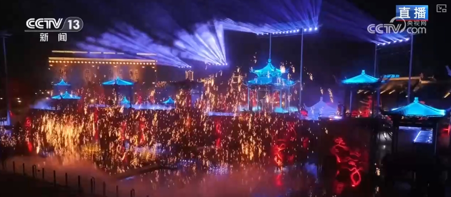 除了沉浸式演出,景区也在上新其他精彩节目。比如非遗打铁花表演,比较常见的表演场景是在地面或者城楼之上。然而在这里,铁花秀的表演场地选在了水面上的一处处亭台楼阁中,火光四射,与楼阁呼应,映照出浓浓的中式美学。