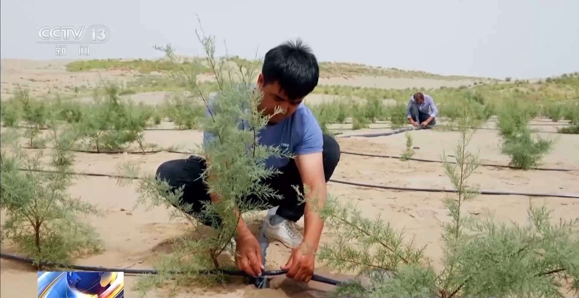 于田县阿热勒乡党委书记 蔡显富:第一年我们种的是梭梭,第二年我们就套种四翅滨藜,这样固沙面积更细,覆盖更全。