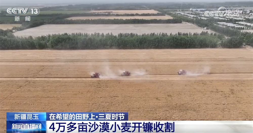眼下,在塔克拉玛干沙漠南缘的新疆昆玉市,4万多亩沙漠小麦陆续成熟开镰收割。当地探索“良种+良法”的沙漠农业种植体系,助力小麦增收。