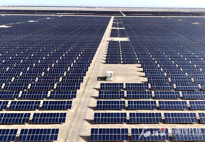 中国绿发新疆中绿电若羌400万千瓦光伏项目,在沙漠里铺成一片蓝色海洋。中国绿发新疆中绿电技术有限公司供图