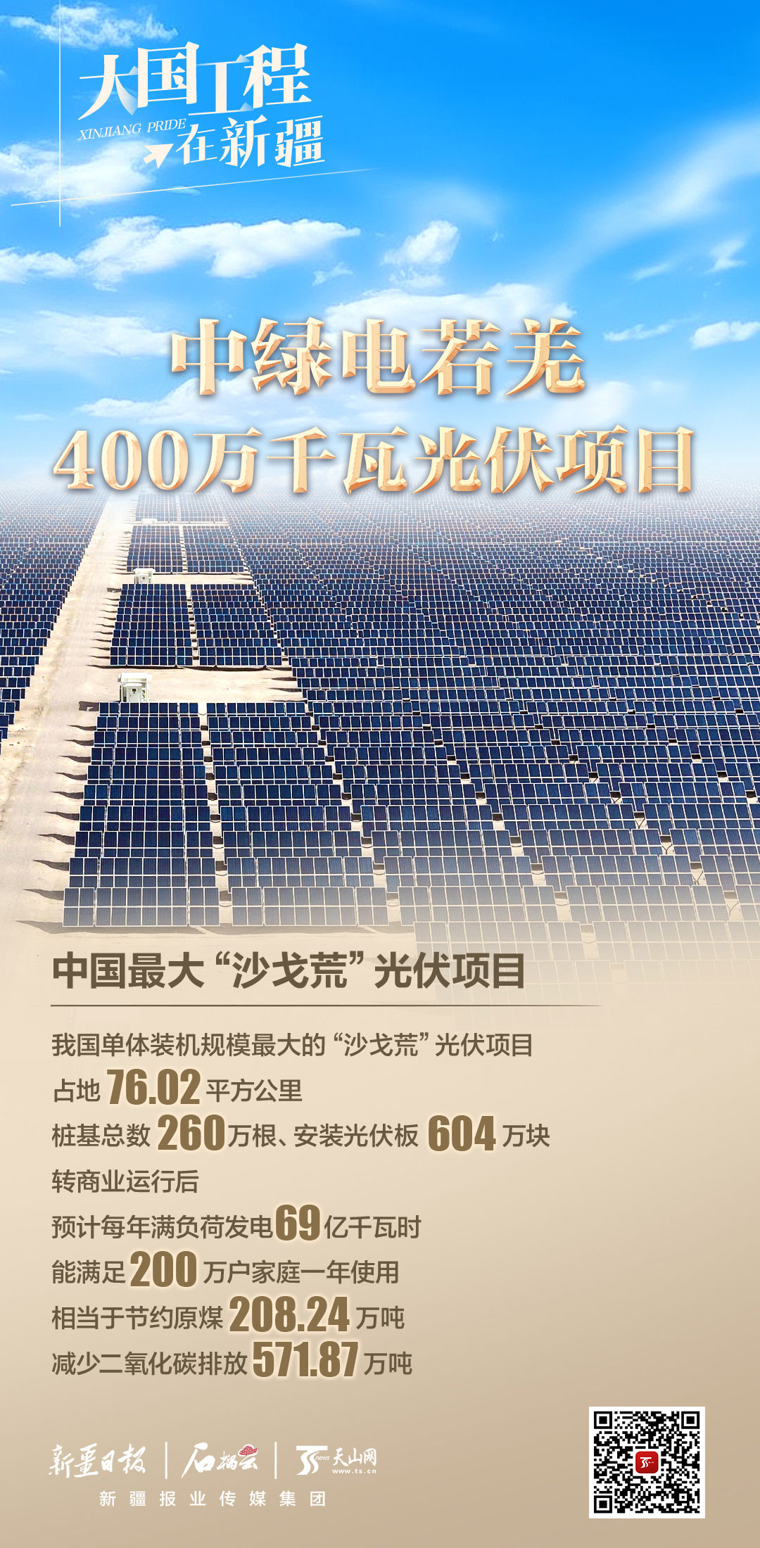 据中国绿发新疆中绿电技术有限公司若羌区域运检中心副经理郭晓阳介绍,项目转商业运行后,预计每年满负荷发电69亿千瓦时,能满足200万户家庭一年使用需求,相当于节约原煤208.24万吨,减少二氧化碳排放571.87万吨。