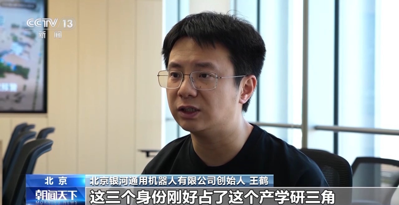 跨学校、跨学科、跨领域,记者发现在智源团队里,有一个特殊的称呼叫作“智源学者”。王鹤,就是智源学者之一,不过他还有两个其他身份,北大博士生导师和企业创始人,他的机器人公司就是由研究院孵化而来。他告诉记者,产业与研究之间的这堵高墙是大模型发展的一大挑战,而这样的多重身份就给了他不少助力。