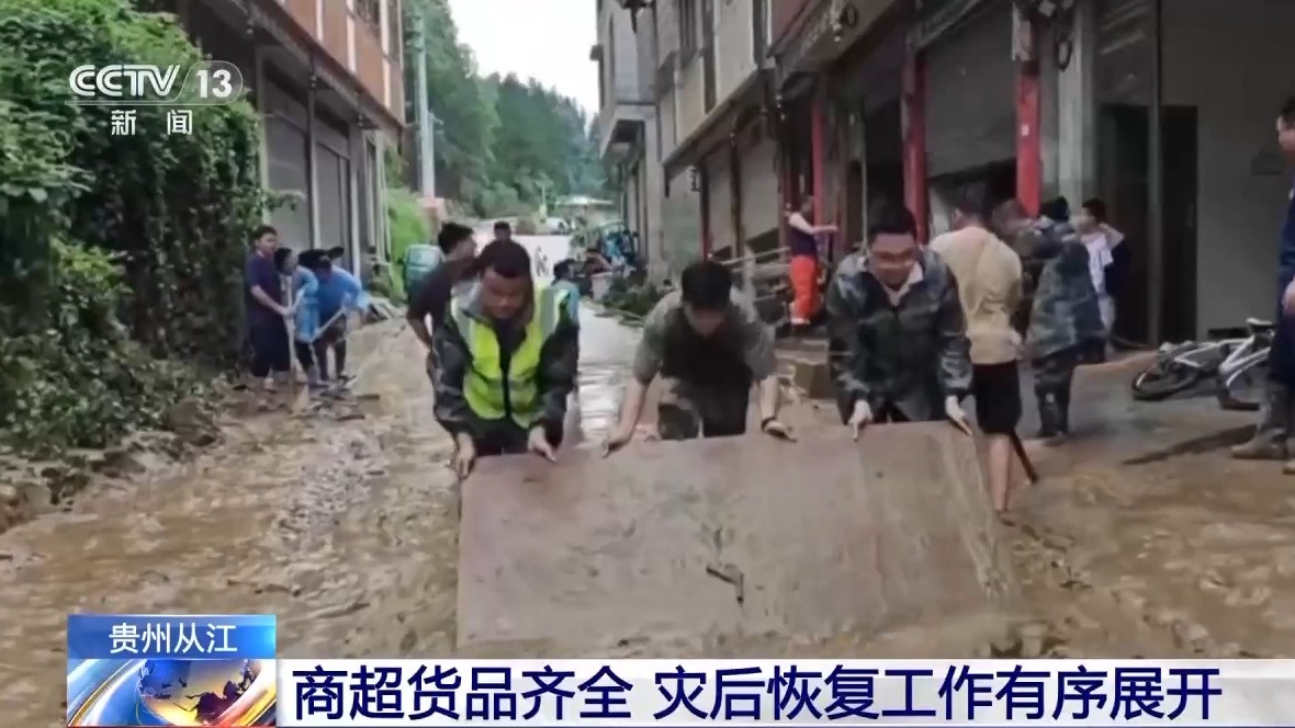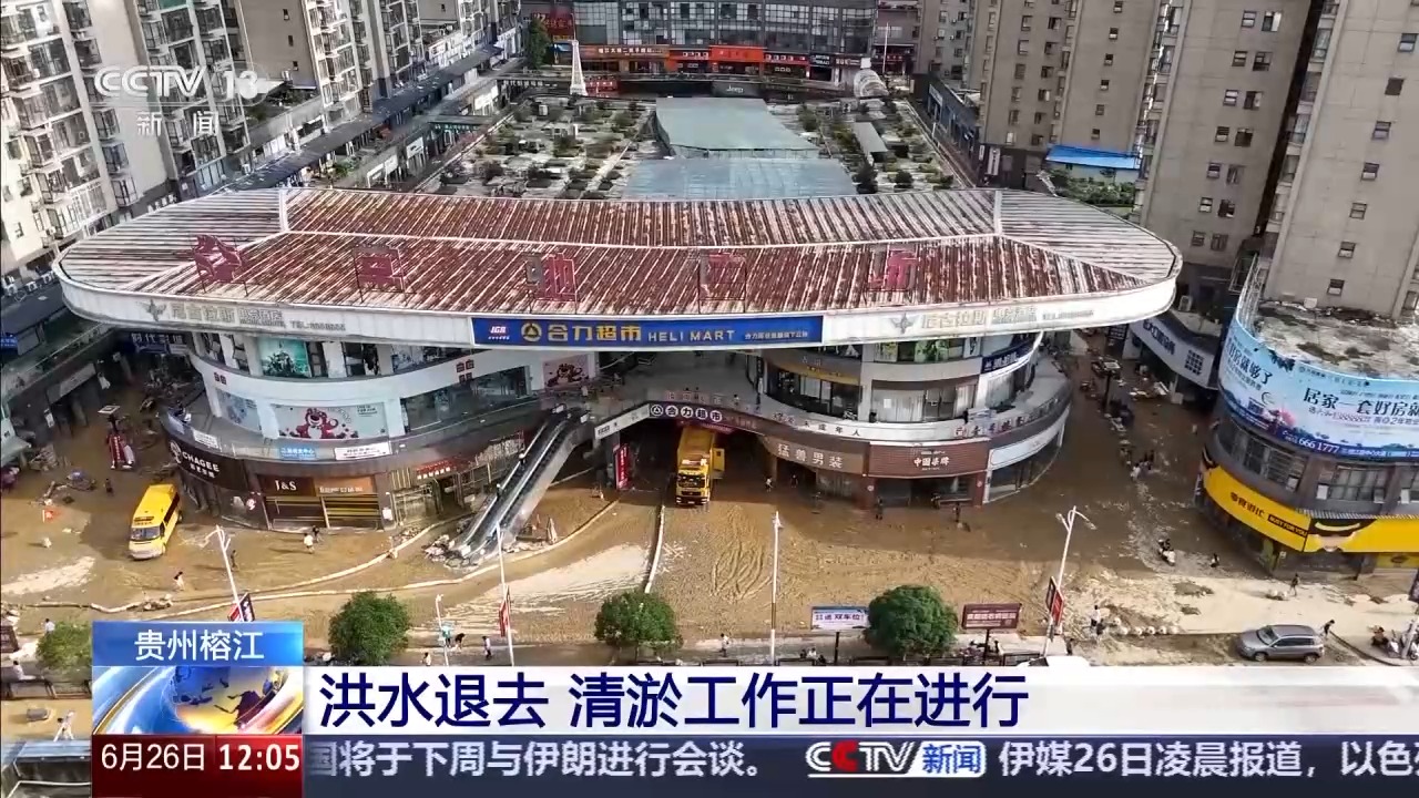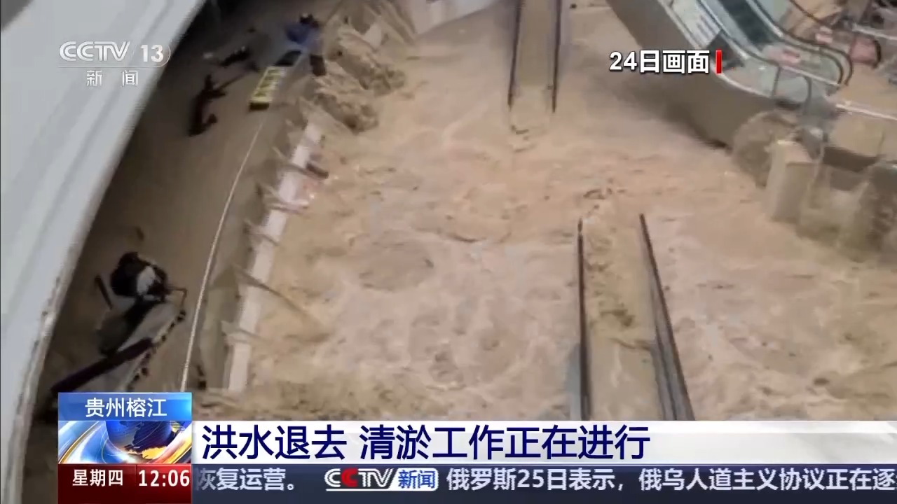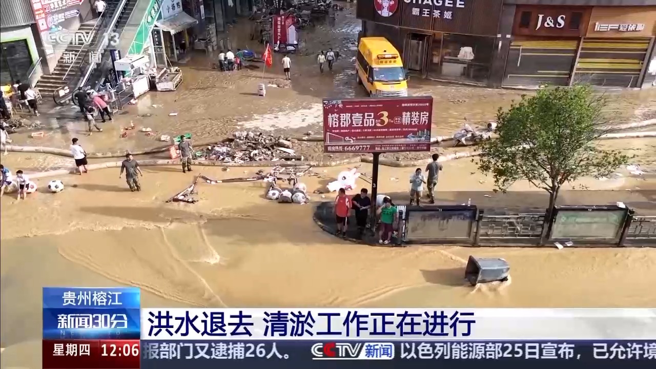 最近,贵州黔东南州遭遇持续强降雨,其中,榕江、从江两县24日先后经历洪峰过境,县城多地被淹,受灾严重。随着降雨暂停,洪水水位明显下降,清淤工作正在进行。