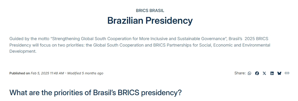 当地时间7月6日,金砖国家领导人第十七次会晤发表里约热内卢宣言,主题为“加强全球南方合作,推动更加包容和可持续的全球治理”。