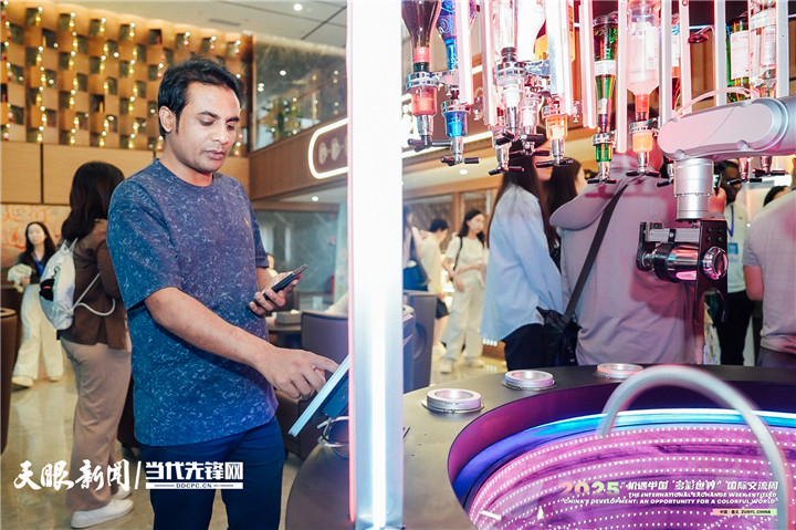 “刚刚我体验了用人工智能调制这杯鸡尾酒,这种创新方式非常有趣。”巴基斯坦青年学者阿里夫·贾维德记录下“中国酒都”现代化的另一面。扫码支付后,玻璃舱内的机械臂马上开始操作:加冰、加酒、摇晃、倒出,不一会儿,一杯特调酒就到了他的手中。