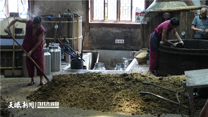 老烧坊里的酿酒师正使用古法酿造技艺酿酒