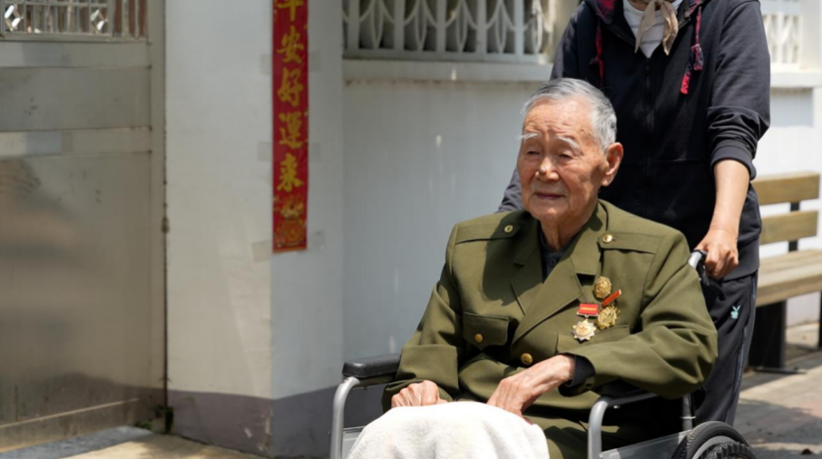 百岁老战士欧立士在扬州家中,唱起《新四军军歌》。