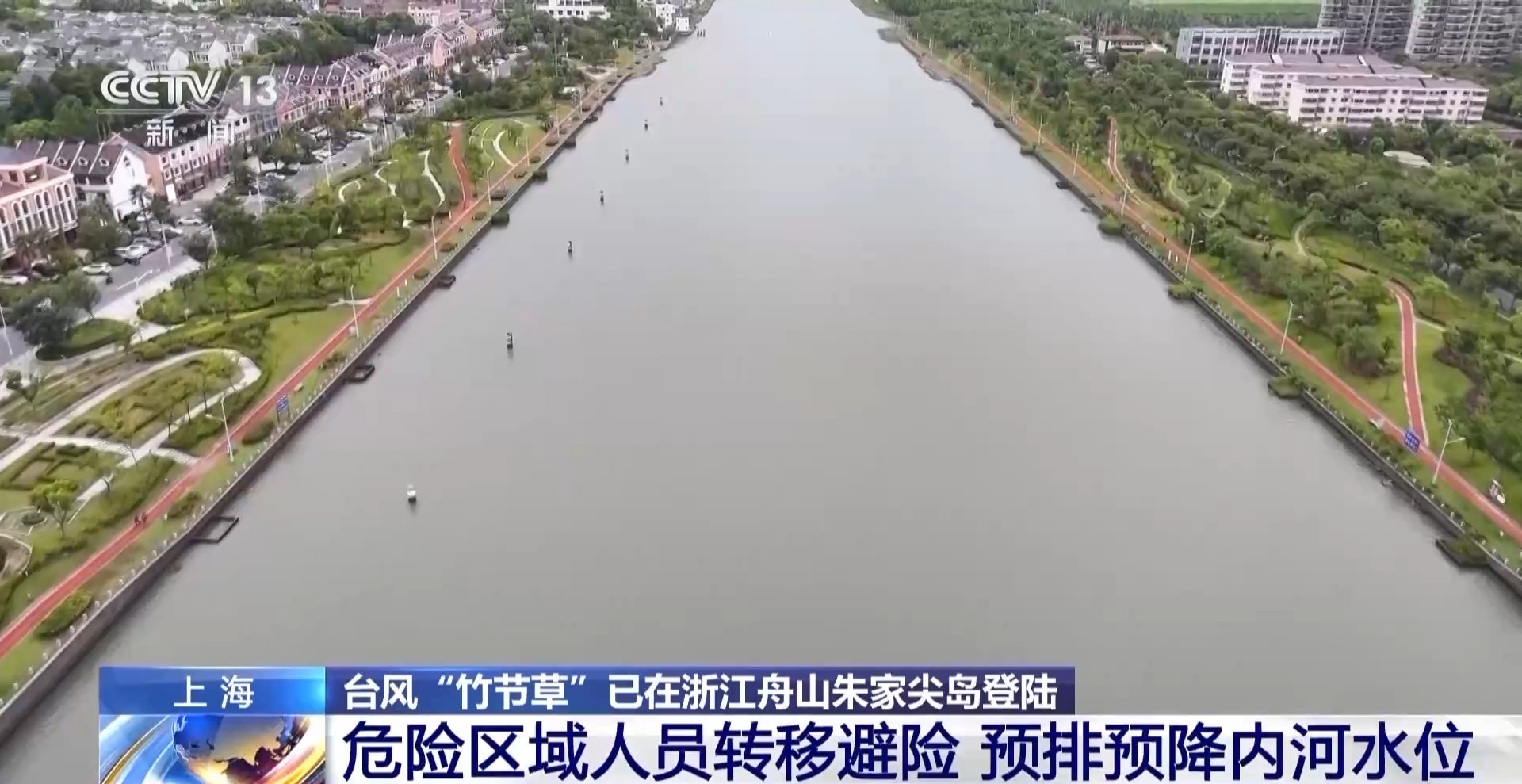 总台记者 张寄予:为应对台风“竹节草”,上海市奉贤区金汇港南闸会进行开闸排水工作。这里一边是内河,一边是杭州湾,当海水落潮的时候,海水水平面低于内河水平面时,就会开启闸口,利用水位落差自然排水。