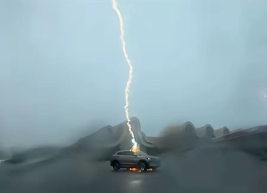 8月5日下午,广西北海铁山港服务区内上演惊险一幕:一辆缓慢行驶的比亚迪宋PLUS EV在雷暴天气中连续三次遭遇闪电直击,强电流在车顶形成明显放电现象,据了解车内女性驾驶员全程未受伤害,并已按原计划继续广西旅程。