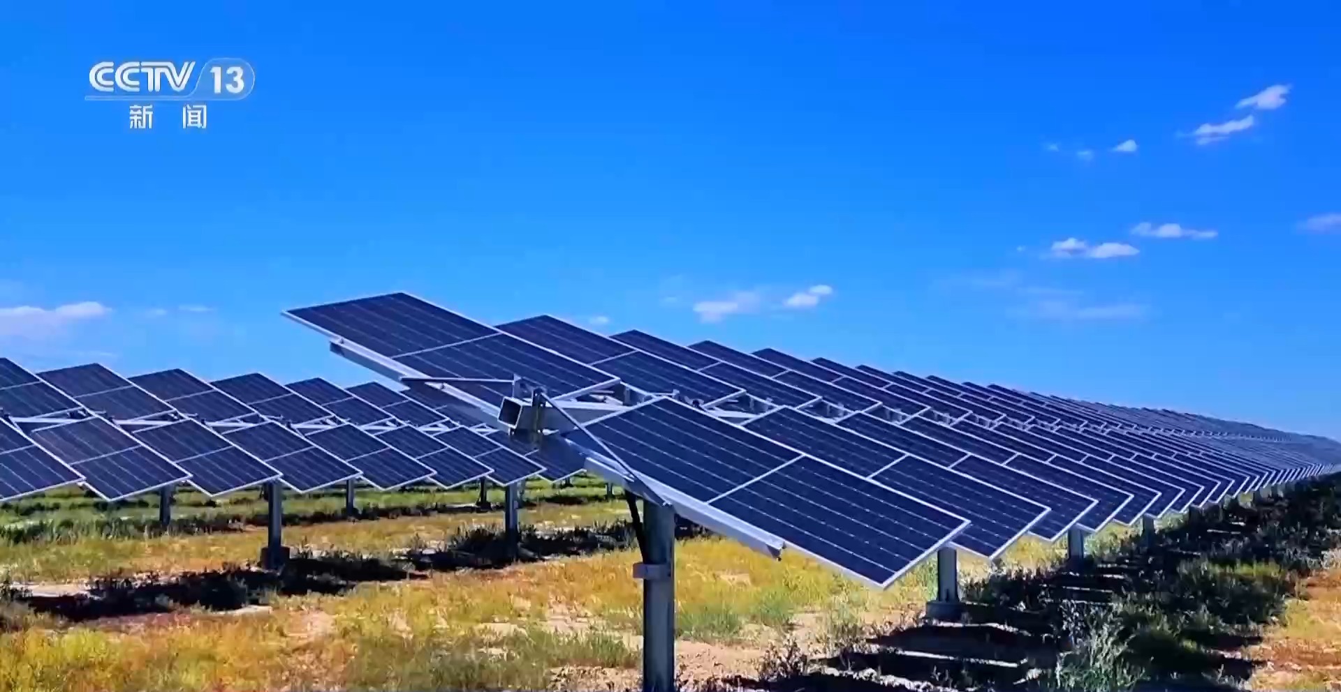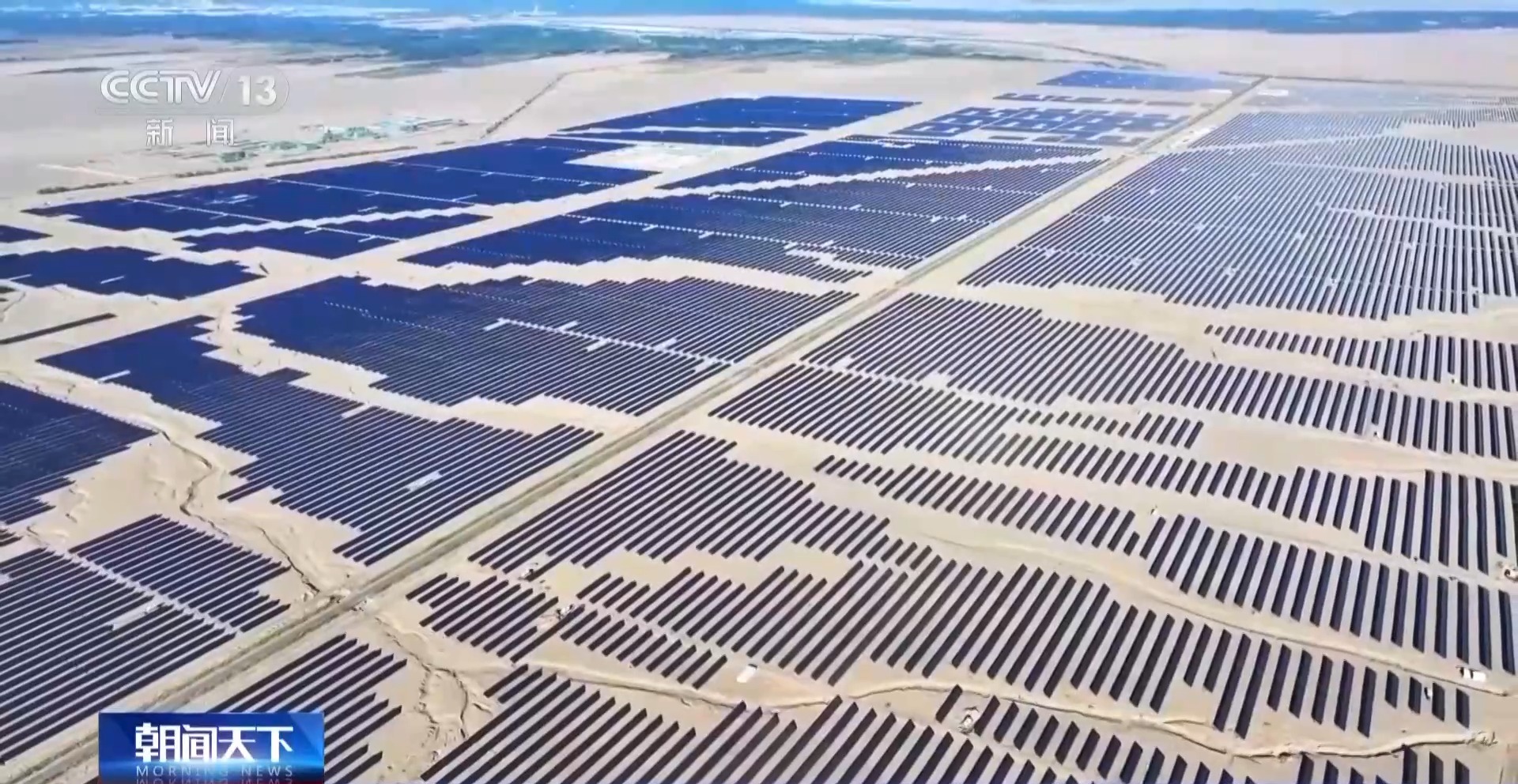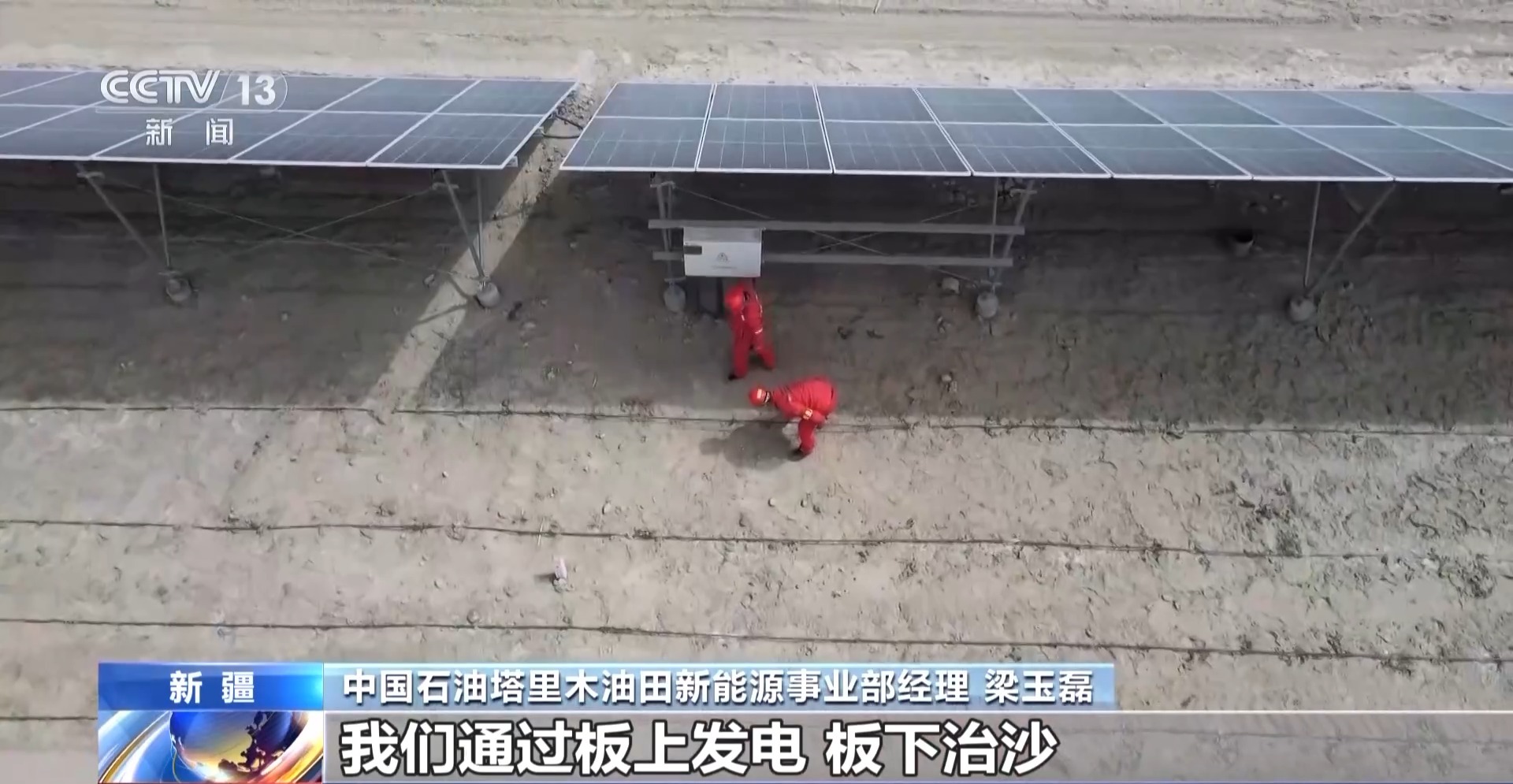 中国石油塔里木油田新能源事业部经理 梁玉磊:我们通过板上发电、板下治沙,建设光伏方阵32个,固沙面积达到4000亩。有效改变了小环境风速,形成“发电-固沙-惠民”一体模式。