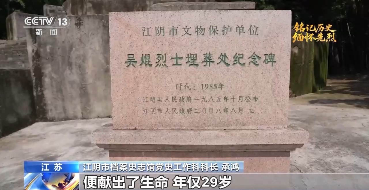 江阴市档案史志馆党史工作科科长 承鸿:他率领部队进军的时候,遭到了国民党军队的冷枪,吴焜头部中弹,未及留下只言片语,便献出了生命,年仅29岁。吴焜参加过长征,历经艰难险阻,在作战和训练当中,处处以身作则,率先垂范。他指挥作战时经常冲在第一线,非常勇猛,正是依靠这种精神和作风,让新四军成为铁军。