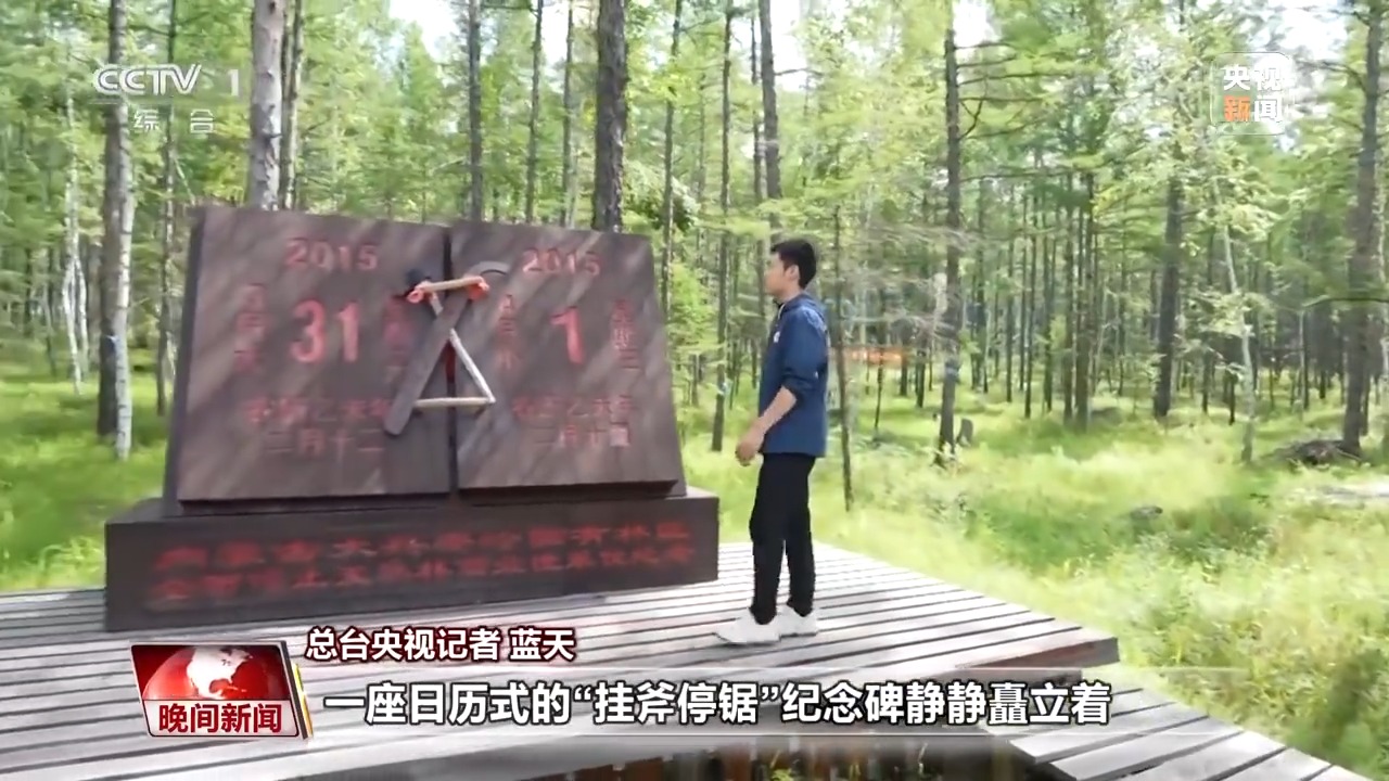 总台央视记者 蓝天:在密林深处,一座日历式的“挂斧停锯”纪念碑静静矗立着。左页,是2015年3月31日;右页,是2015年4月1日。十年前,随着最后一棵兴安落叶松在这里倒下,内蒙古大兴安岭林区正式告别了长达63年的“伐木时代”。