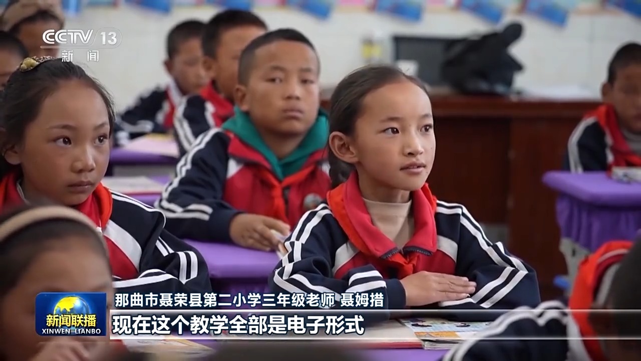 那曲市聂荣县第二小学三年级老师 聂姆措:变化特别大,以前乡镇里面都是帐篷学校,黑板就是这么小的一个木板,冬天帐篷里面的话,手脚都是冻着的。现在这个教学全部是电子形式,条件特别好。