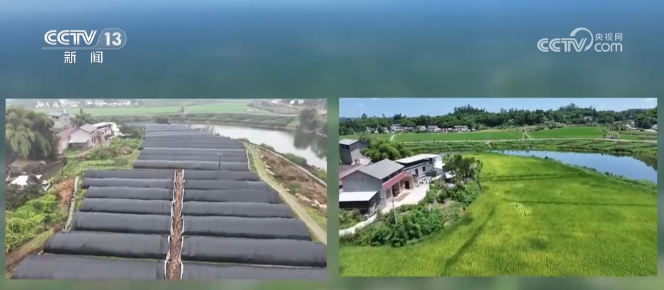 左边的画面是今年2月份记者采访时拍摄的当地稻田冬季大棚种植羊肚菌的画面,而画面的右侧是同一个地块此时此刻的状态。老乡说,去冬今春,他们种羊肚菌亩产收入达到了15000元,而通过水稻密植新技术,水稻的亩产预计能突破750公斤,高标准农田的致富优势更加明显。