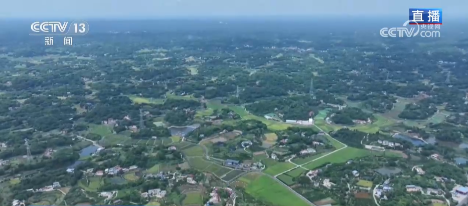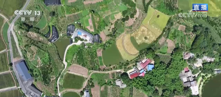 从空中俯瞰,画面最下方的稻田一直到远处的天际线,一个个深绿色的丘陵小山包,铺满了大地棋盘,镶嵌其间的浅绿略带金黄的部分,是下周到月底将陆续收割的水稻田,除此之外,在丘陵之间的低矮洼地,还有蜿蜒流淌的小河,与星星点点的鱼塘、池塘,在西南地区的丘陵山地间,大地用深浅不一的绿色,诉说着乡村里的生机勃勃。
