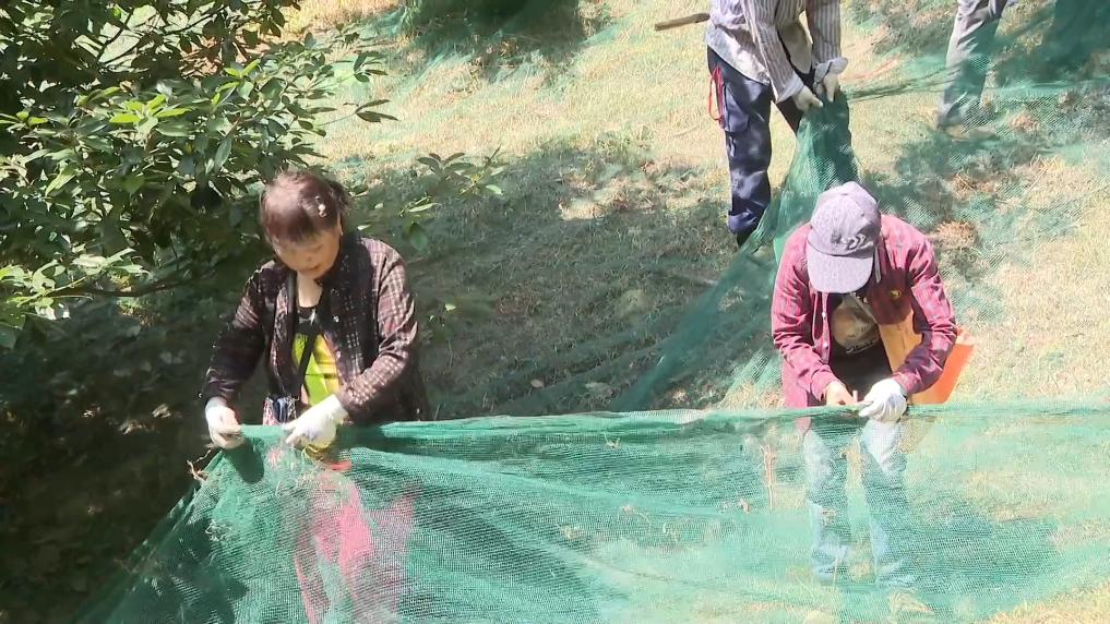 同样忙碌的,还有位于临安区清凉峰镇白果村的种植大户王立平。在他家的山头上,白色的采收网从山脚铺到山顶,绵延数公里长。除了做好采收前的准备,他还提前招募了采收工。