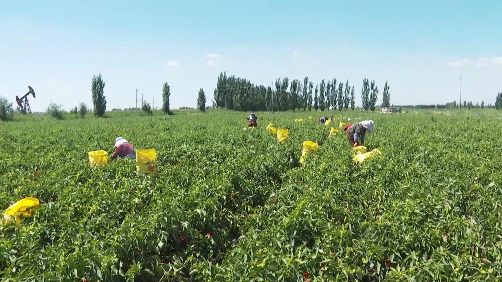 在焉耆回族自治县永宁镇下岔河村的辣椒种植地里,红彤彤的辣椒挂满枝头,椒农们穿梭其中,采摘着成熟的辣椒。
