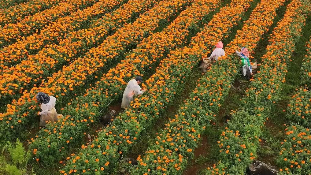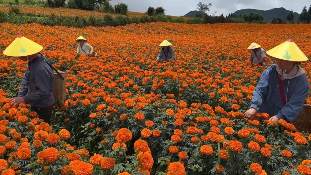 近日,在云南省蒙自市,金黄的万寿菊迎来丰收期。花农们正穿梭在田间,娴熟地采摘着花朵。