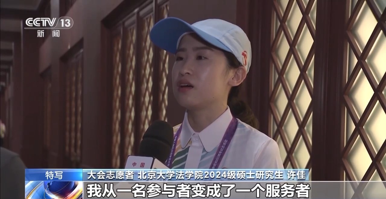 大会志愿者 北京大学法学院2024级硕士研究生 许佳:当时我是一个高呼团结起来、振兴中华的热血青年,而这一次作为志愿者,我从一个参与者变成了一个服务者,希望能够用我专业的态度来服务好观礼人员。每当我能够指引一个观众正确找到他所想要去到的点位,就能够让大会的时钟正确走一秒钟,能够让我感受到我和4000多名志愿者的贡献,能够共同托举整个大会的顺利举办,我觉得是非常荣幸,也希望能够成为一名闪闪发光的螺丝钉。