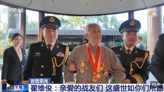 9月3日,纪念中国人民抗日战争暨世界反法西斯战争胜利80周年大会在北京隆重举行。现场观礼台上,有一位近百岁的老人——翟维俊。十年前,他曾在抗战老兵方队中乘车通过天安门接受检阅;今年,他作为支前模范代表,在观礼台上与抗战英雄们一起见证盛世。