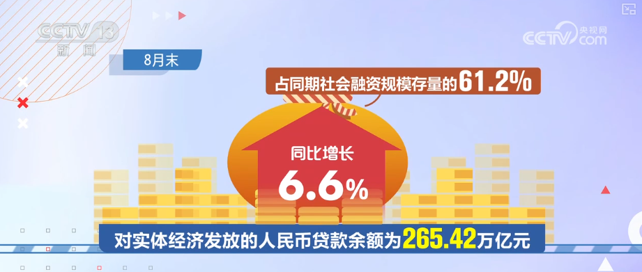 初步统计,8月末,社会融资规模存量为433.66万亿元,同比增长8.8%。其中,对实体经济发放的人民币贷款余额为265.42万亿元,同比增长6.6%,占同期社会融资规模存量的61.2%。