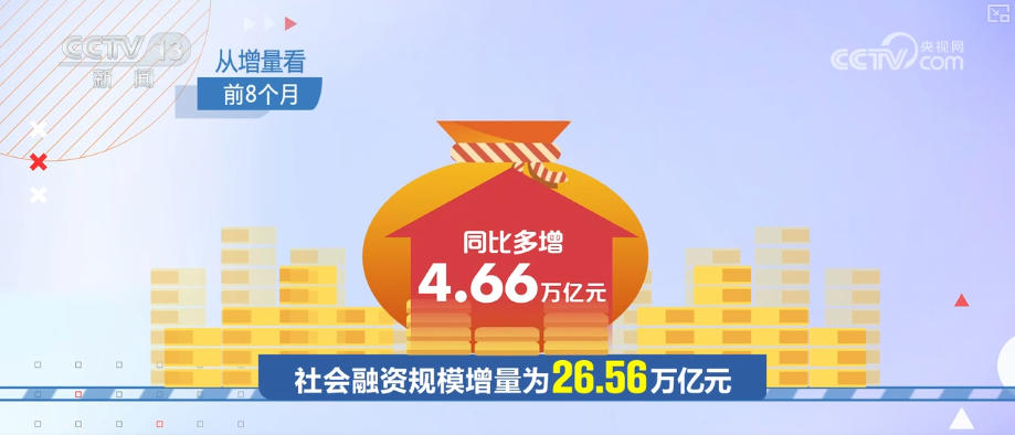 从增量看,前8个月,社会融资规模增量为26.56万亿元,同比多增4.66万亿元。
