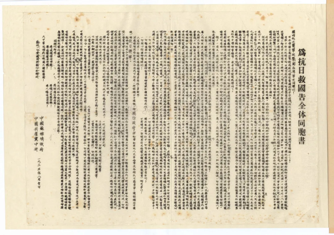 1935年8月1日,《中国苏维埃政府、中国共产党中央为抗日救国告全体同胞书》。来源:中国档案杂志