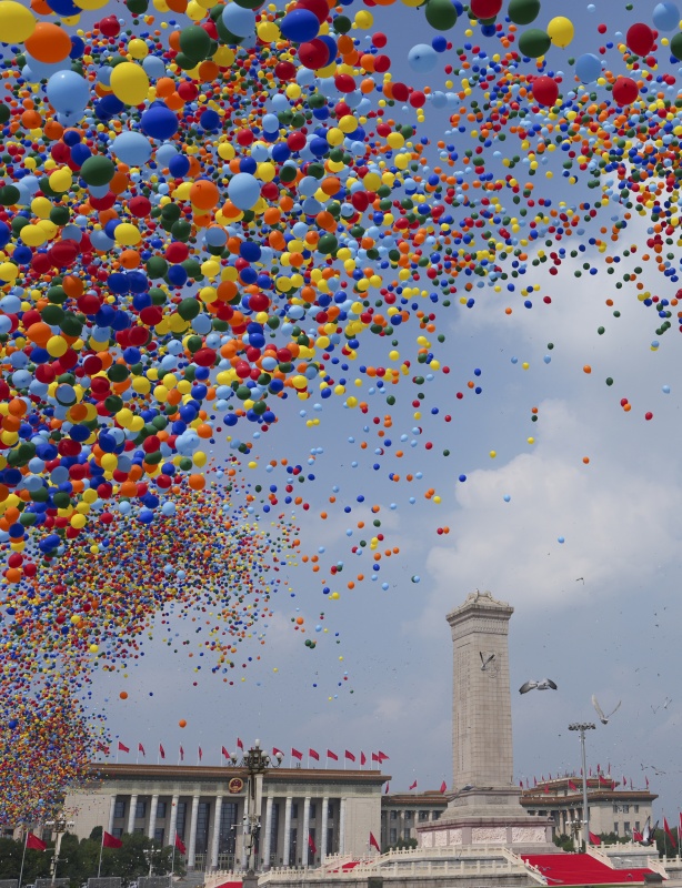 2025年9月3日,纪念中国人民抗日战争暨世界反法西斯战争胜利80周年大会在北京隆重举行。这是纪念大会现场放飞气球和鸽子。新华社 发