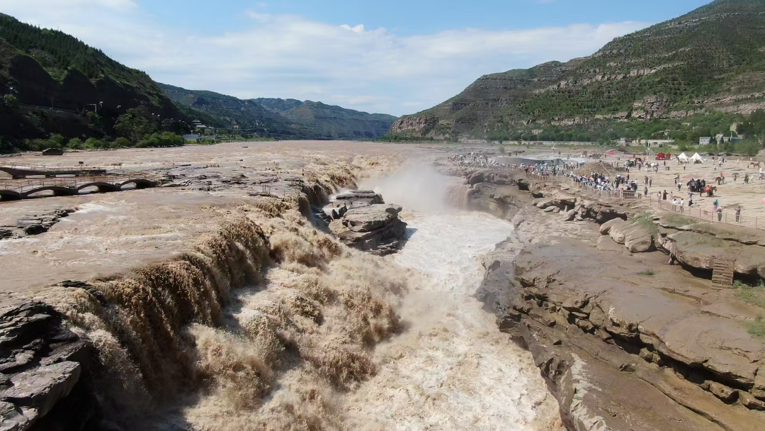 黄河进入壶口,河道陡然收束,滚滚河水以雷霆万钧的炸裂之势咆哮而下。7月初,正值黄河丰水期,站在壶口瀑布延安宜川一侧岸线,中华民族母亲河的磅礴伟力和动人心魄扑面而来。