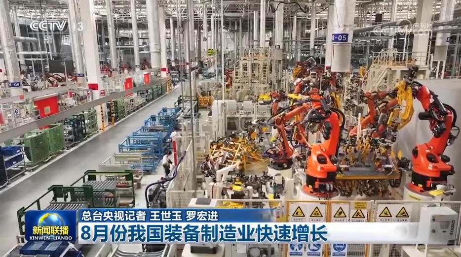 央视网消息(新闻联播):8月份,我国规模以上装备制造业增加值同比增长8.1%,主要产品产销两旺,有力推动工业经济平稳运行。