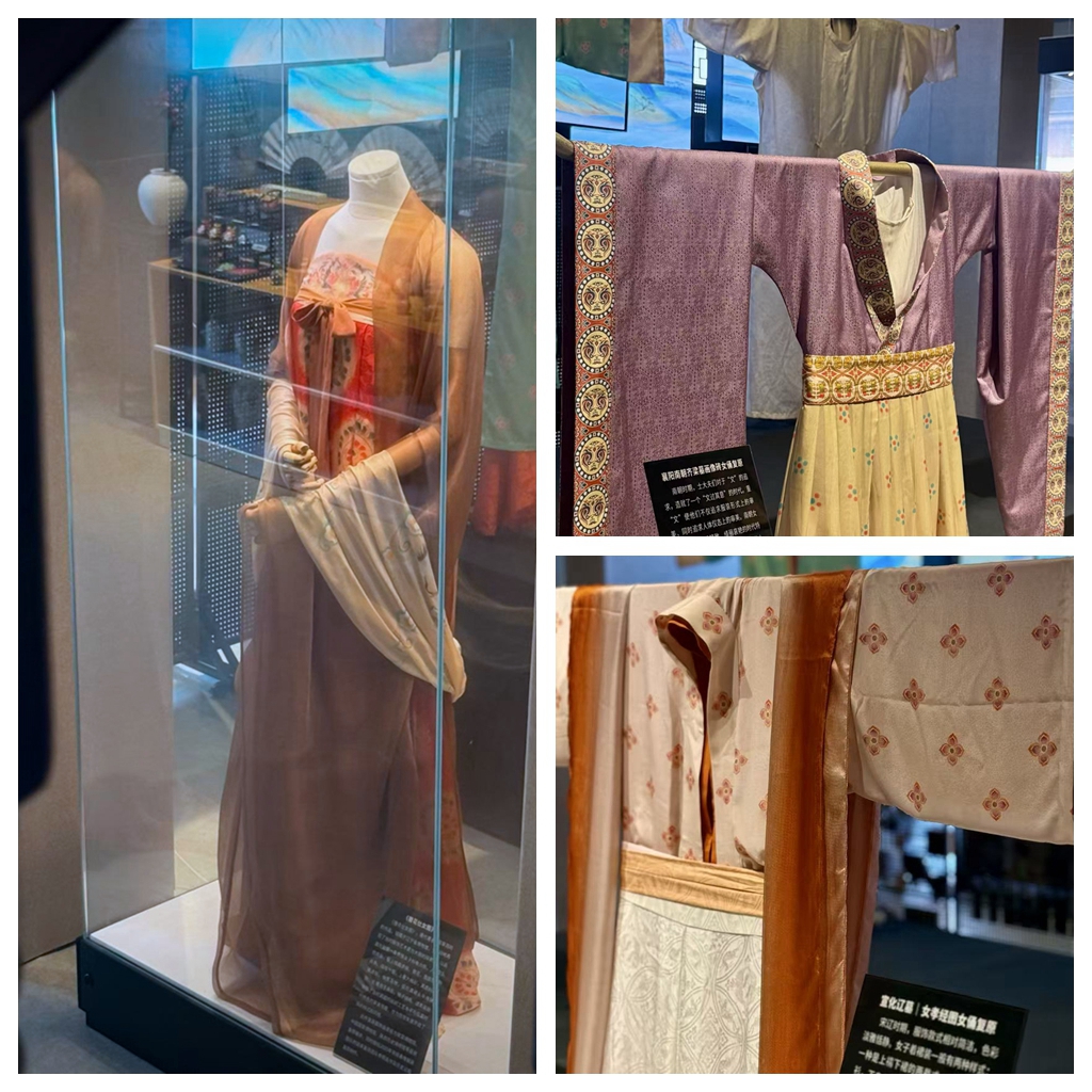 展览馆的核心亮点之一,是《簪花仕女图》《听琴图》等二十余套历史人物服饰的高精度复刻。每一件服饰均依据出土文物、古籍文献及壁画资料,由专业团队采用传统织造和刺绣工艺结合现代审美复原完成。例如《簪花仕女图》中的唐代衫裙,使用缂丝与印金工艺还原。这些服饰既是艺术品,也是可触可感的“穿越媒介”。