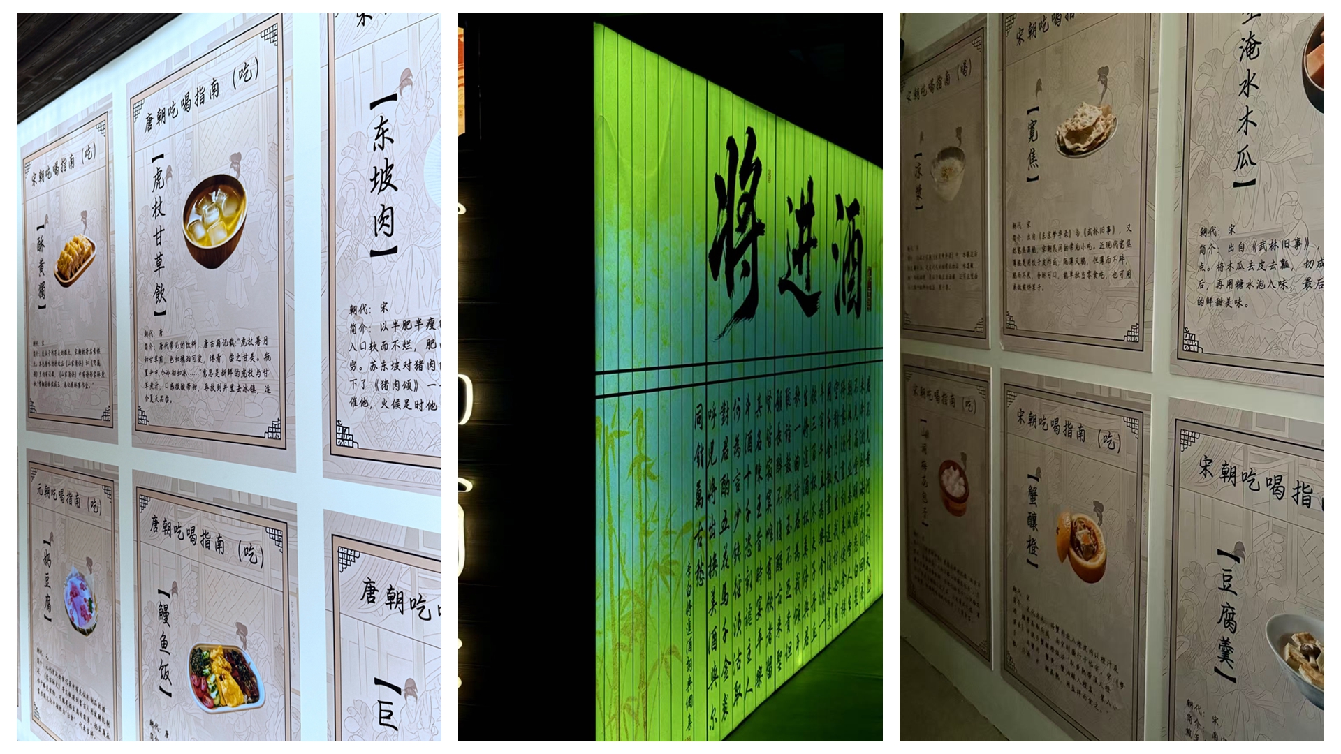 在展厅内,《韩熙载夜宴图》被完整复原为一场可听、可看、可品的多感官宴会——乐舞笙歌之间,参观者既能领略南唐贵族的生活美学,还能尝到依据古法复原的唐代“镂金龙凤蟹”、宋代“山家三脆”等历史菜肴。展览馆也尝试打破一些固有认知,比如如今流行的三文鱼刺身,其实最早源自中国古代的“鱼鲙”技艺,在《诗经》中便已有记载。