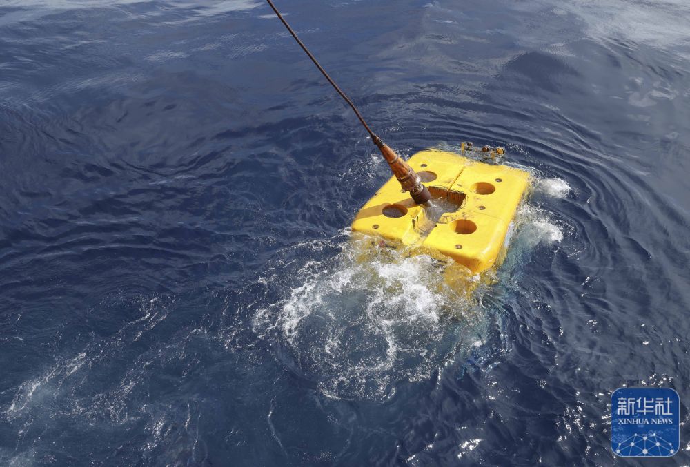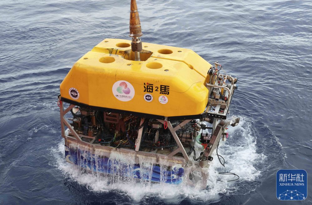 ↑9月18日,采集“源火”后,“海马”号深海遥控潜水器从海底返回,浮出水面。新华社记者 卢汉欣 摄