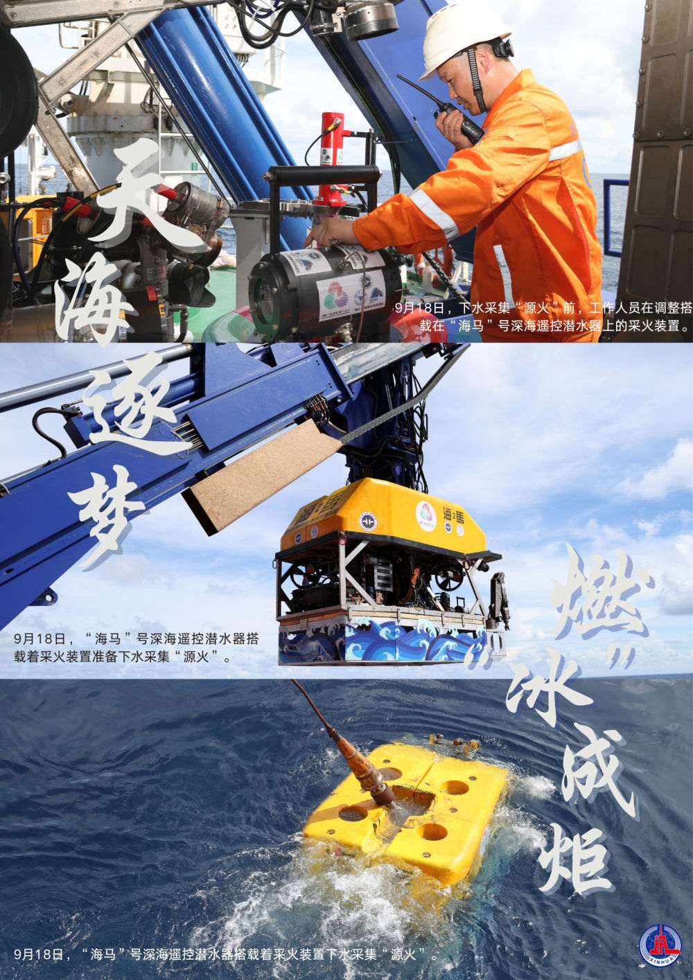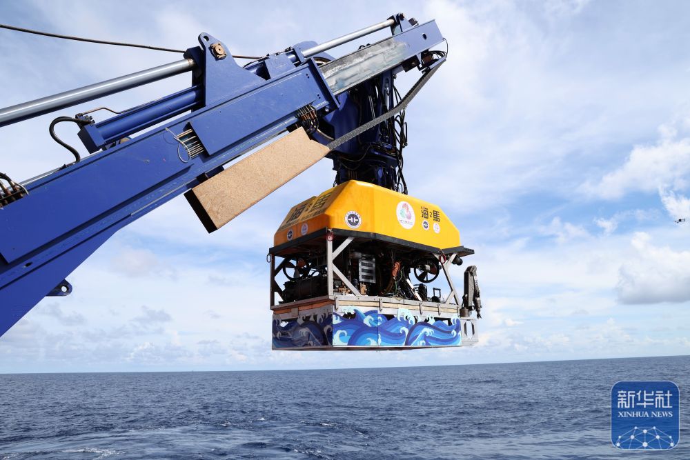 ↑9月18日,“海马”号深海遥控潜水器搭载着采火装置下水采集“源火”。新华社记者 卢汉欣 摄