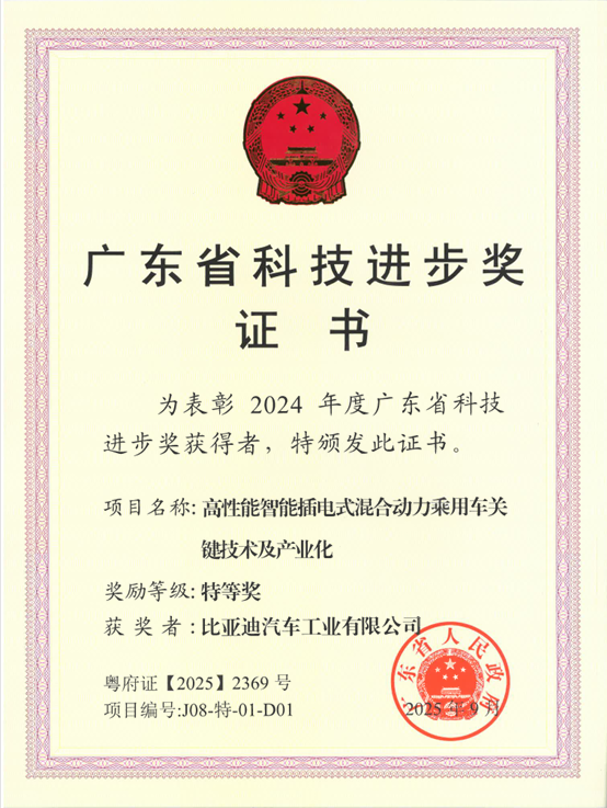 近日,2024年度广东省科学技术奖正式公布,比亚迪研发的“高性能智能插电式混合动力乘用车关键技术及产业化”项目——第五代DM技术荣获科技进步奖特等奖,彰显了其在插混技术领域持续领先的创新实力,这是比亚迪近四年来第二次获得该奖项。