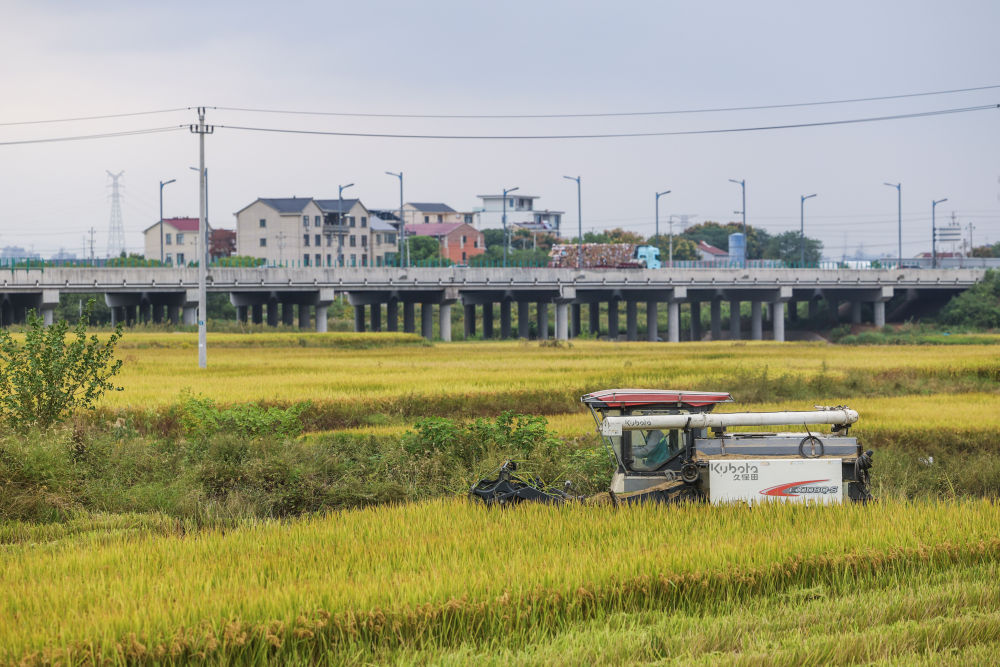 这是10月22日,收割机在浙江省金华市金东区塘雅镇万亩良田示范区收割水稻。新华社记者 徐昱 摄