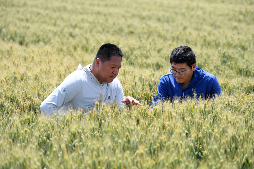 这是农户和农业技术员在山西运城永济市虞乡镇的麦田里查看小麦生长情况(5月21日摄)。新华社发(薛俊摄)