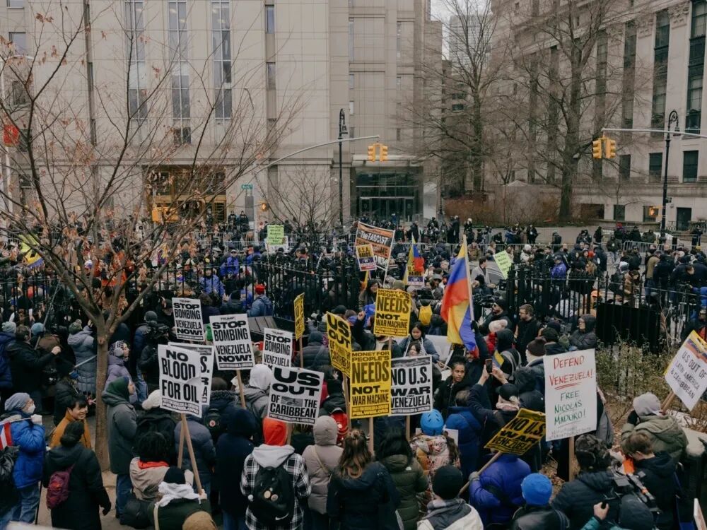 当地时间1月5日,在纽约联邦法院外,民众抗议美国对马杜罗的审判。