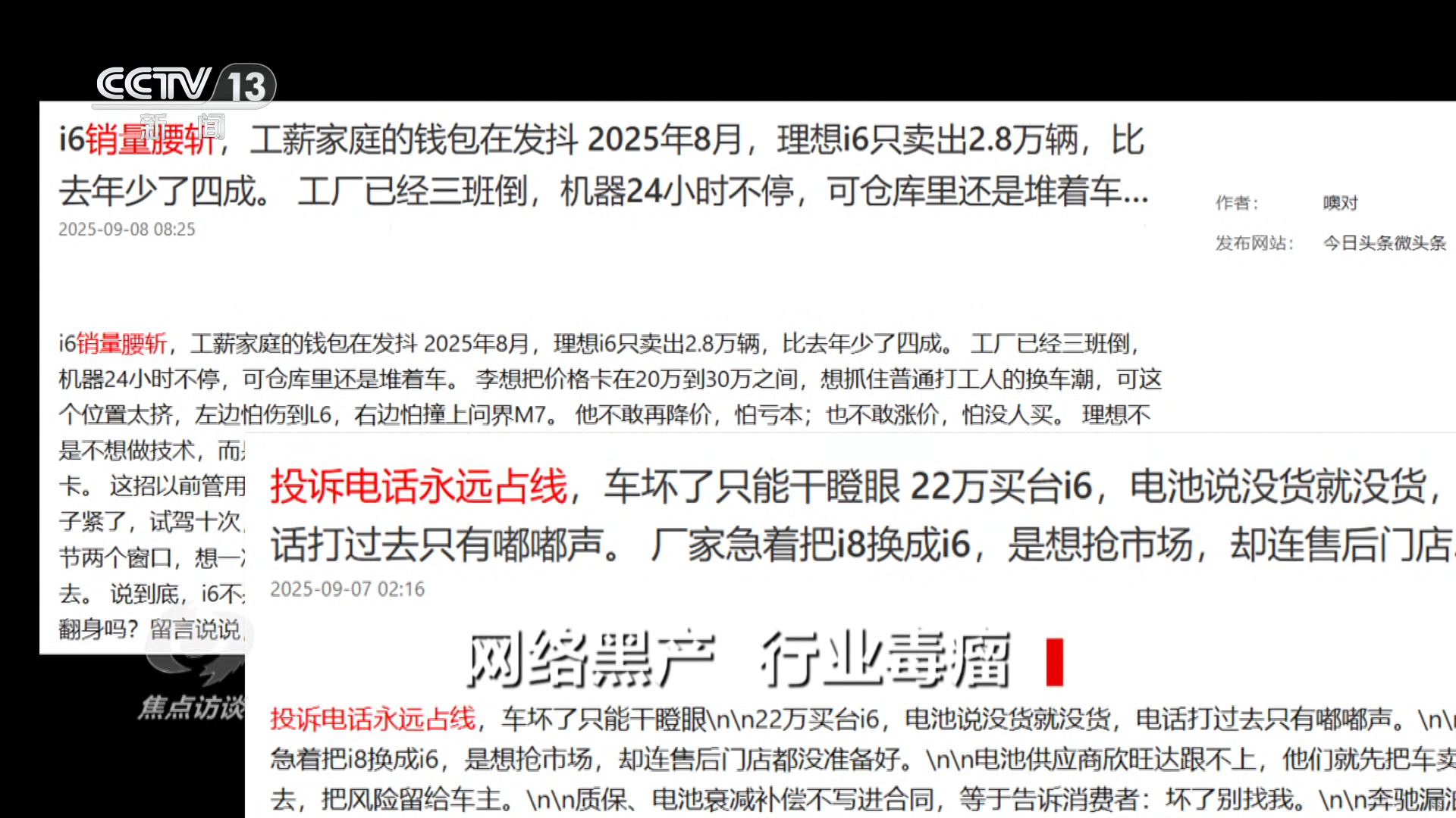 央视网消息(焦点访谈):数据显示,2025年,我国新能源汽车产销量均超1600万辆,新能源汽车国内新车销量占比突破50%。也就是说每卖出两辆新车,就有一辆是新能源车。然而,在整个行业迅猛发展的同时,也出现了一些不和谐的现象。出于恶性竞争的目的,有的新能源汽车专业博主发布网络虚假信息,不同车企相互拉踩,攻击相互竞争的产品。这不仅严重误导消费者,也成为阻碍产业健康发展的公害。从去年九月开始,国家相关部门针对此类乱象开展了专项打击行动。那么,这些网络攻击有什么样的新特征?是随意的用户吐槽,还是成组织的商誉诋毁?目的又是什么呢?来看记者调查。