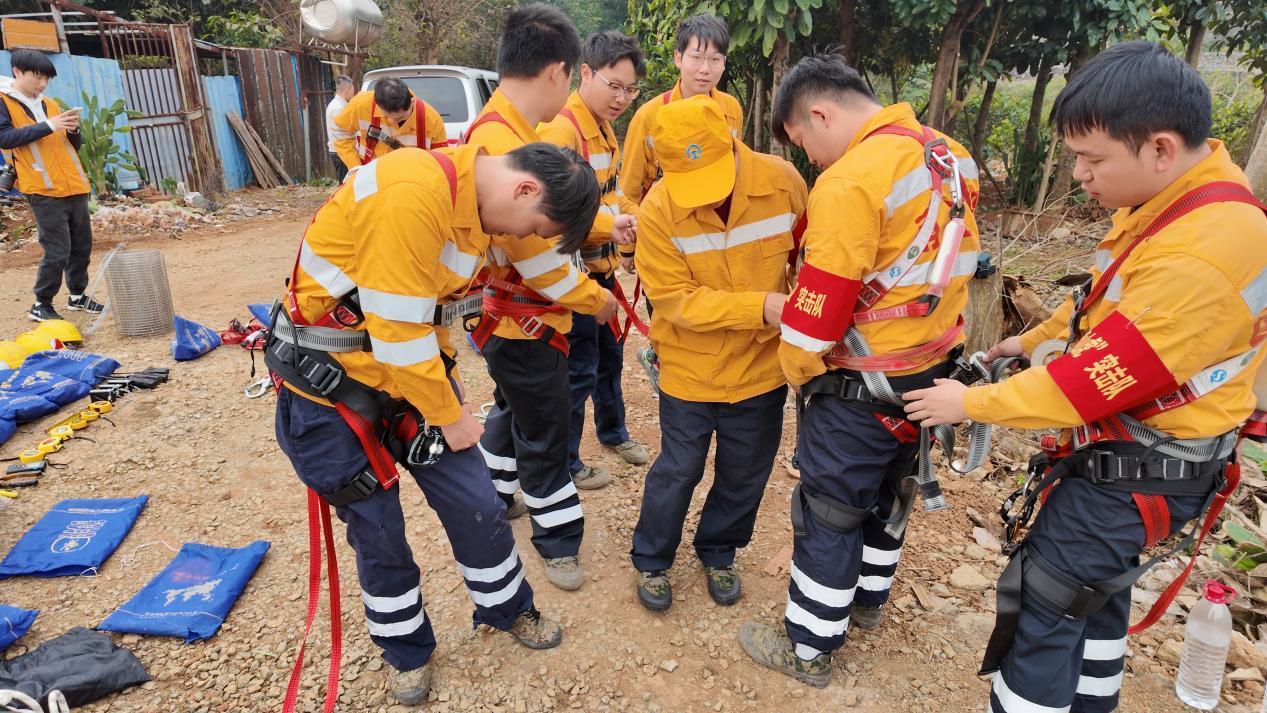 “爬山虎”突击队队员穿戴安全绳和安全帽