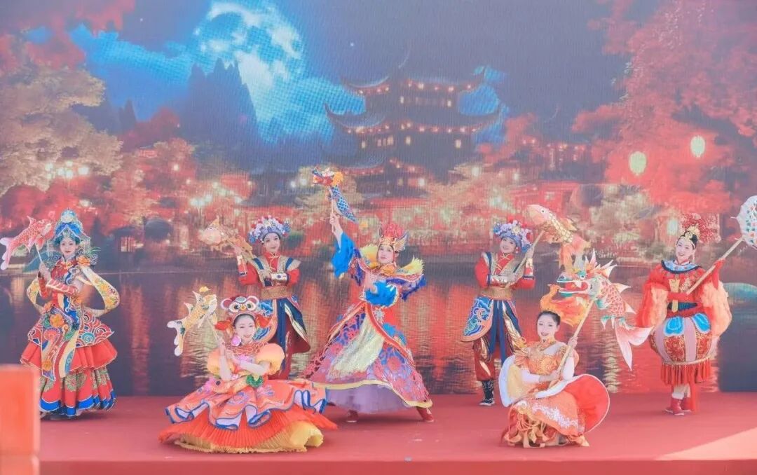 将剪纸的神韵、灯笼的精巧、年画的鲜活、糖画的灵动、掐丝珐琅的绚丽、戏曲的典雅,六大非遗元素巧妙融合的创意舞蹈《灯韵华章》拉开了启动仪式的序幕。