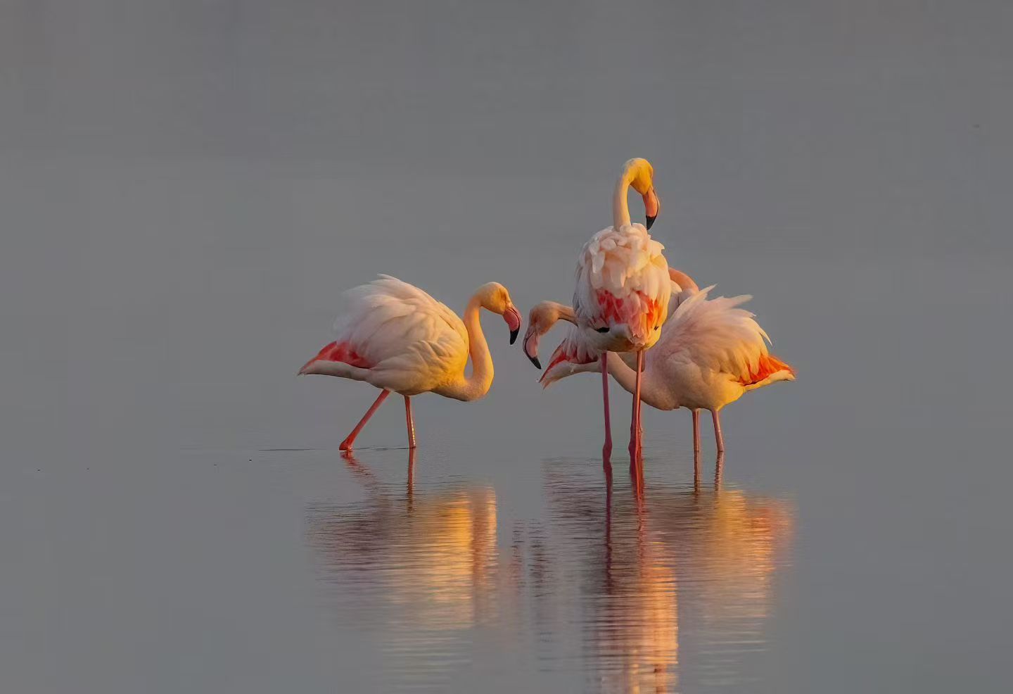 “火烈鸟是国家一级保护动物,十分罕见,它们爱吃咱盐池里的卤水虫,所以年年都会来。”老徐一边给记者科普,一边叮嘱观鸟的“规矩”。语毕,停车。在一片开阔的湖面上,四只羽毛红似晚霞、腿细长如玉簪的火烈鸟正在悠然觅食。早已有一群观鸟爱好者蹲守多时,“大炮”似的长焦镜头比手臂还长。“鸟友”们见新来了人,颔首一笑,又赶忙把视线移回相机。
