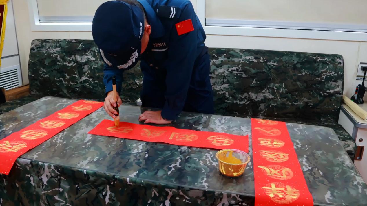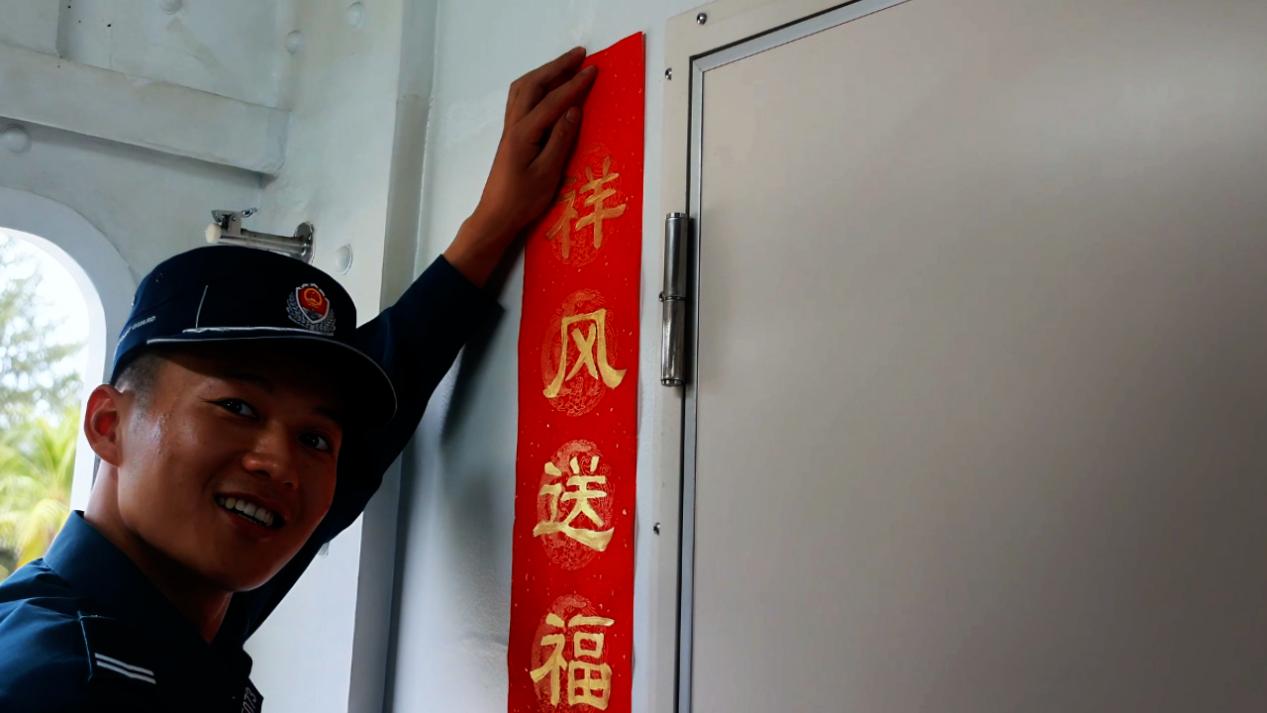 除夕清晨,第一缕阳光洒向艇舷,横山艇上早已热闹起来。铺开一张张洒金红纸,执法员们以艇为案、以海为境,研墨挥毫,笔走龙蛇。“祥风送福入华堂,春开锦路”,一副副手书春联,字字铿锵、墨香袅袅,将执勤的舰艇妆点得暖意氤氲。那悬于舱门、贴于舷边的中国红,是刻在心底的年节记忆,此刻化作流动的文化血脉,在万里海疆上诉说着对家国的眷恋、对亲人的牵挂。