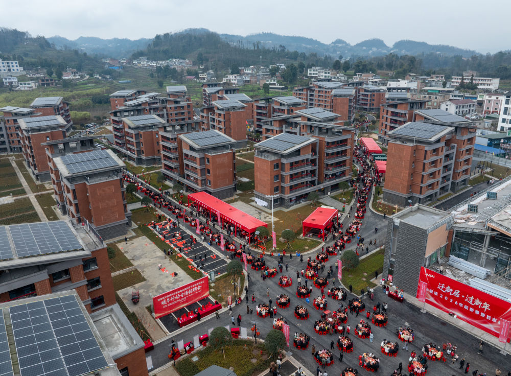 1月31日,在四川宜宾筠连县沐爱镇金坪村避险搬迁安置小区,受灾群众办百家宴迎新年(无人机照片)。新华社记者 江宏景 摄